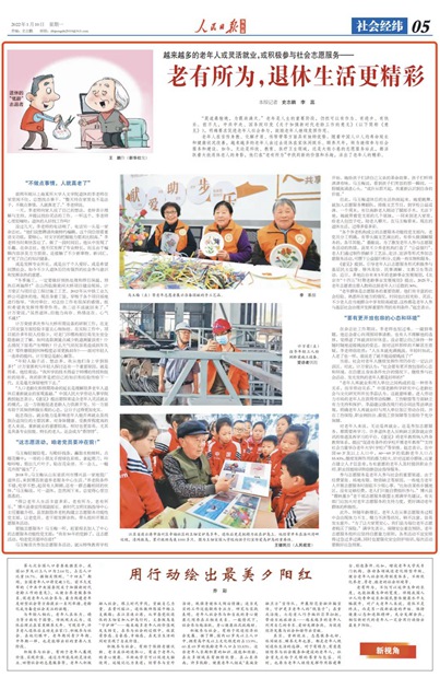 老年人在言傳身教、化解矛盾、傳幫帶等方面具有獨(dú)特優(yōu)勢。隨著中國人口人均壽命延長和健康狀況改善,越來越多的老年人由過去退休在家休閑娛樂、頤養(yǎng)天年,轉(zhuǎn)為繼續(xù)參與社會(huì)服務(wù)和建設(shè)。如今,無論是科技、教育、醫(yī)療衛(wèi)生領(lǐng)域,還是大街小巷的志愿服務(wù)站點(diǎn),都活躍著大批退休老人的身影,他們?cè)凇袄嫌兴鶠椤敝姓业叫碌膬r(jià)值和樂趣,活出了老年人的精彩。