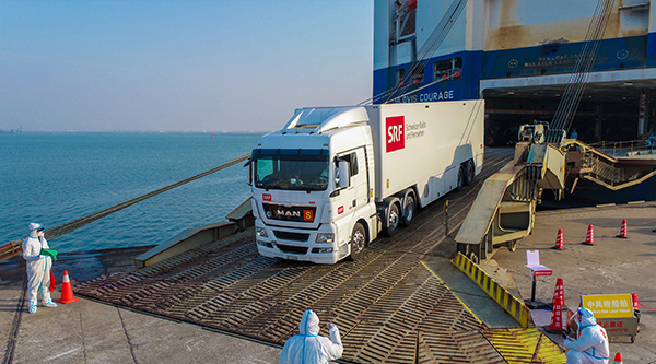 1月15日上午,載運(yùn)著6輛北京冬奧會(huì)轉(zhuǎn)播車(chē)的韓國(guó)籍“現(xiàn)代英勇”輪靠泊天津港。本批冬奧物資由天津出入境邊防檢查總站東港邊檢站完成快速入境查驗(yàn)后,將直接運(yùn)送至北京冬奧場(chǎng)館。