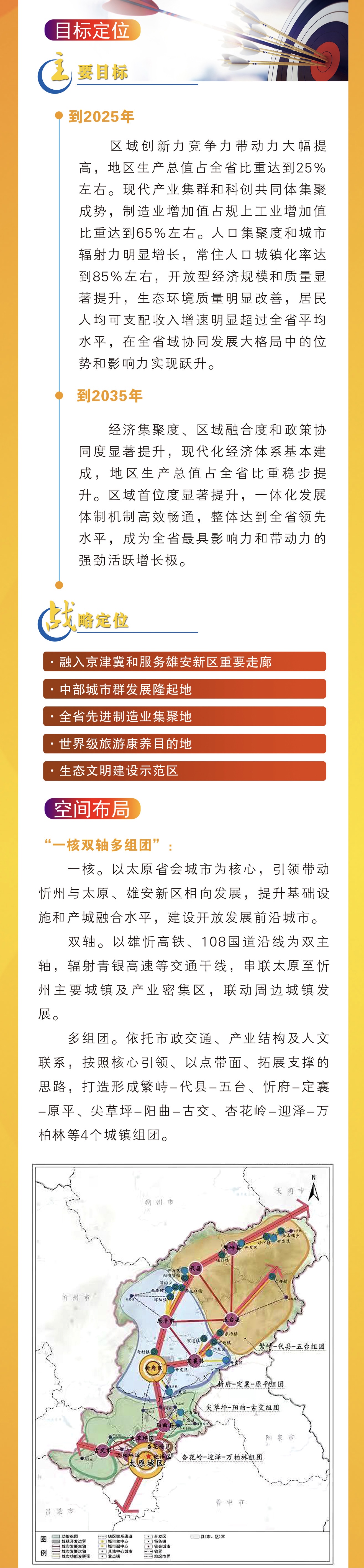《指導意見》謀劃確定了太忻一體化經濟區(qū)的實施范圍,提出了融入京津冀和服務雄安新區(qū)重要走廊、中部城市群發(fā)展隆起地、全省先進制造業(yè)集聚地、世界級旅游康養(yǎng)目的地、生態(tài)文明建設示范區(qū)等五大戰(zhàn)略定位和“一軸雙核多組團”的空間布局,分2025年、2035年兩個時間節(jié)點明確了發(fā)展目標,部署了六個方面的重點任務。