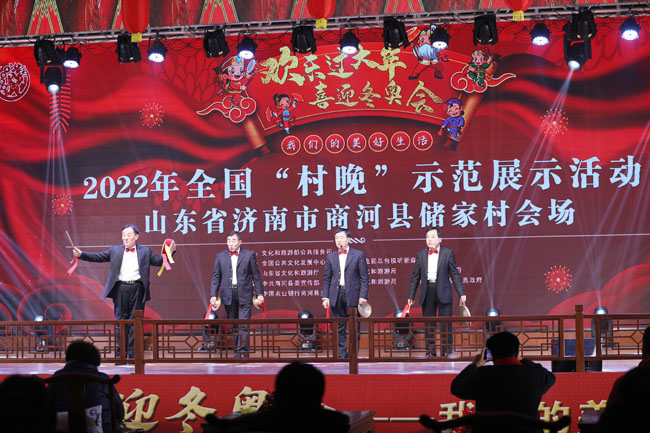 據(jù)商河縣文化和旅游局局長趙欒星介紹,儲家村文化大集自2011年以來每逢農(nóng)歷三、八,群眾便會自發(fā)組織來儲家村登臺獻藝,至今已有十年。本次“村晚”的舉辦,受到廣大群眾的積極響應,演出的節(jié)目多為當?shù)厝罕娮跃幾詫ё匝荩ü魑?、東信民歌等商河本土年俗特色和優(yōu)秀民間文化得到充分展現(xiàn),“年味”“鄉(xiāng)土味”“文化味”呈現(xiàn)了人民歡樂過大年,喜迎冬奧會的愉悅心情和滿懷豪情創(chuàng)造幸福美好新生活的奮進精神。