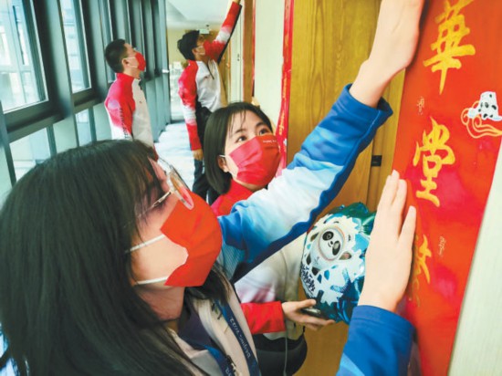 服務(wù)保障人員的村內(nèi)生活也趣味十足。下午3點(diǎn)多,一場(chǎng)“守海陀歲·延慶冬奧村新村民共贏未來(lái)”主題活動(dòng)在訪客中心舉行?!拔⑿Φ难瑸榇蟮亻_(kāi)花;愛(ài)灑向手心,純潔無(wú)瑕……”中外志愿者們用12種語(yǔ)言唱起北京冬奧會(huì)志愿者之歌《燃燒的雪花》,擊鼓傳花,匿名交換明信片,現(xiàn)場(chǎng)溫馨又熱鬧。而在媒體中心,志愿者寫(xiě)福字,貼福字,迎接春節(jié)和冬奧的到來(lái)。晚上6點(diǎn)多,延慶冬奧村還迎來(lái)了“志愿者虎年春節(jié)聯(lián)歡晚會(huì)”,志愿者各顯身手帶來(lái)彈唱、傳統(tǒng)曲藝、芭蕾舞表演等節(jié)目,以“線上村晚”開(kāi)啟新的一年。