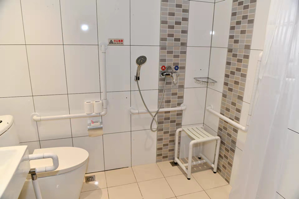 酒店前臺設置了低位服務臺,坐著就可以辦理入住登記等手續(xù)。進入電梯后,電梯按鈕上附有盲文,方便視力障礙人士使用;鏡面、扶手、語音播報一應俱全。來到客房部,走廊平整開闊,鋪設了防滑地膠,客房的房門也進行了拓寬。進入客房內(nèi),低位開關、無障礙寫字桌、開放式衣柜等,讓人感覺溫暖、舒適。衛(wèi)生間里配備了各類無障礙設施,淋浴區(qū)一側的墻壁上裝有無障礙扶手,并配備了無障礙淋浴椅和寬大的浴室鏡等。低位洗手盆旁邊,是低位置物架,上面放著擦手巾。