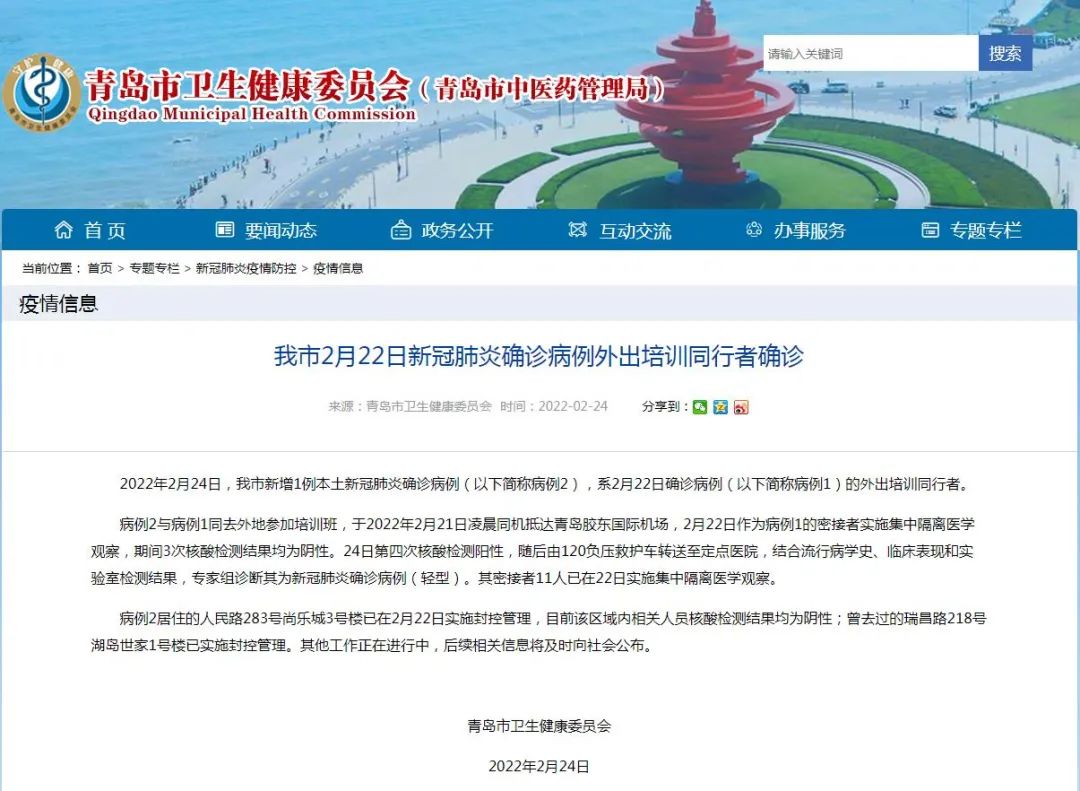 人民網(wǎng)青島2月24日電(鄭浦麗)據(jù)青島市衛(wèi)生健康委員會消息,2022年2月24日,青島市新增1例本土新冠肺炎確診病例(以下簡稱病例2),系2月22日確診病例(以下簡稱病例1)的外出培訓(xùn)同行者。