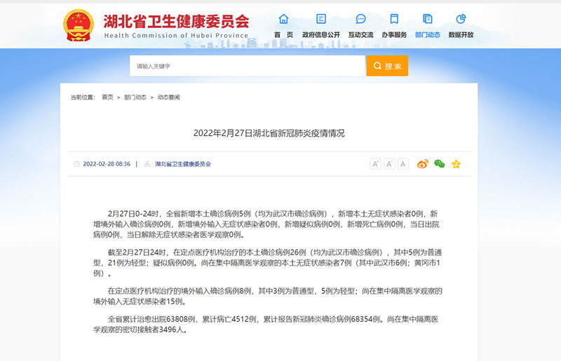 截至2月27日24時(shí),在定點(diǎn)醫(yī)療機(jī)構(gòu)治療的本土確診病例26例(均為武漢市確診病例),其中5例為普通型,21例為輕型;疑似病例0例。尚在集中隔離醫(yī)學(xué)觀察的本土無癥狀感染者7例(其中武漢市6例;黃岡市1例)。