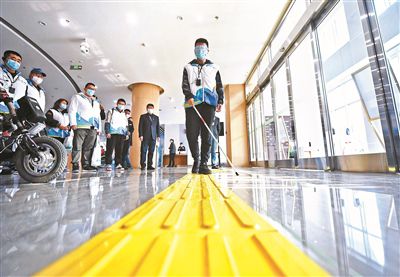 北京2022年冬殘奧會(huì)正在舉行,殘奧運(yùn)動(dòng)員在賽場(chǎng)上的奮勇拼搏贏得了世界的掌聲。作為冬殘奧會(huì)的舉辦地之一,近年來(lái),北京市的無(wú)障礙環(huán)境服務(wù)保障水平顯著提升且更有溫度。昨天,剛啟用不久的北京市殘疾人服務(wù)示范中心(以下簡(jiǎn)稱“示范中心”)迎來(lái)了16位城市志愿者。他們?cè)诙瑠W組委無(wú)障礙體驗(yàn)員的帶領(lǐng)下,戴上眼罩體驗(yàn)盲道、坐在匯愛(ài)影廳里“聽(tīng)”電影、體驗(yàn)科技助殘的力量。
