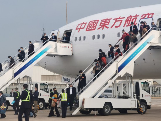 3月10日下午,在滬全國(guó)政協(xié)委員乘東航班機(jī)返滬。上海市政協(xié)供圖