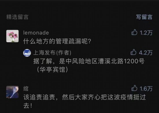 是什么地方的“疏漏”?“上海發(fā)布”在留言區(qū)直白回復網(wǎng)友:“據(jù)了解,是中風險地區(qū)漕溪北路1200號(華亭賓館)”。