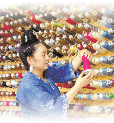 2021年9月16日,在貴州省黔東南苗族侗族自治州施秉縣舞水云臺旅游商品開發(fā)有限公司扶貧車間里,繡娘在趕制苗繡產(chǎn)品訂單。