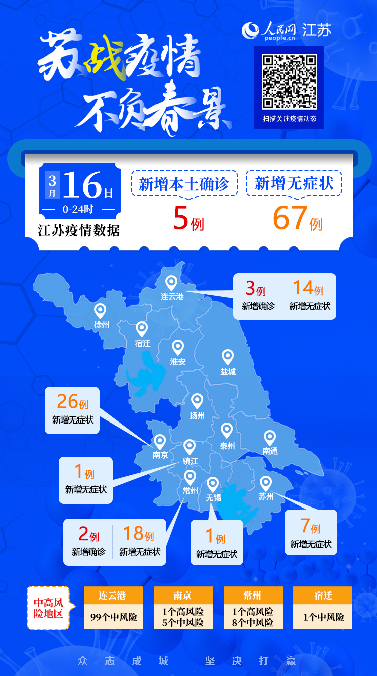 3月16日,江蘇全省累計(jì)新增5例本土確診病例,67例無癥狀感染者,涉及常州、連云港、南京、蘇州、無錫、鎮(zhèn)江。3月16日晚,南京棲霞通報(bào)5名陽性感染者,目前南京疫情涉及江寧、秦淮、棲霞三區(qū)。