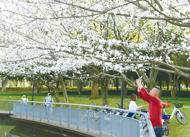 3月17日下午,在浙江義烏植物園,數(shù)百株櫻花在綠水環(huán)抱間悄然綻放。微風(fēng)拂來,雪球般的櫻花輕輕搖曳枝頭,美不勝收。不少市民和游客前來賞花、拍照,享受春日美景。(錢旭升)