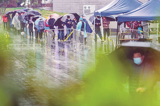 3月17日,南京市民在雨中有序排隊等待核酸檢測。本報記者 吳俊 攝