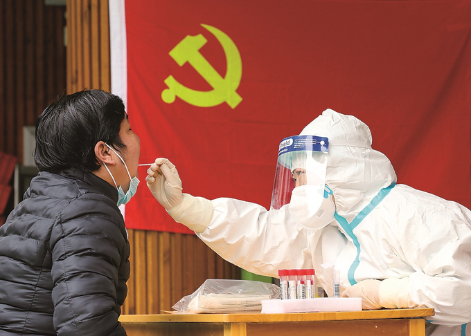 南京一處核酸檢測點,黨旗高懸。 本報記者 陳儼 攝