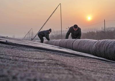 2月11日,遵化市東新莊鎮(zhèn)南崗村的農(nóng)民在為蔬菜大棚保溫。
