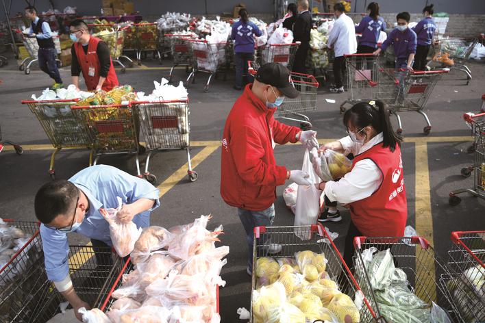 3月29日,在嘉興市區(qū)一超市秀洲店,店員們加班加點(diǎn)打包蔬菜、肉、油等1500份物資。這些物資將被送到“三區(qū)”,保障群眾的日常生活需求。(王振宇)