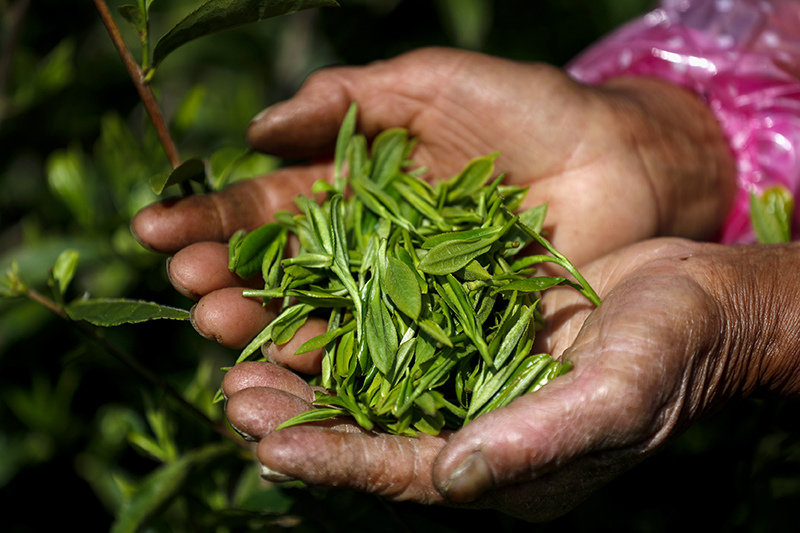 在安徽祁門縣,采茶工在茶園采摘新茶。施亞磊攝