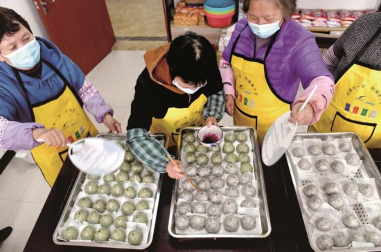 4月1日,嘉興市秀洲區(qū)新塍鎮(zhèn)虹橋社區(qū)請來轄區(qū)的幾位巧手奶奶一起做青團(tuán),送到志愿者手中,讓他們在“抗疫”一線也能吃上熱乎乎的時令美食。(馮玉坤)