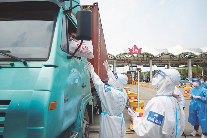 以“同心抗疫 我們在行動”為主題的貨車司機關(guān)愛活動最近在我省多地開展,志愿者們?yōu)樨涇囁緳C送去“抗疫愛心包”,提供暖心服務(wù)。圖為20日,在南京繞城高速棲霞收費站出口,志愿者向貨車司機送上“抗疫愛心包”。本報記者 陳儼 攝