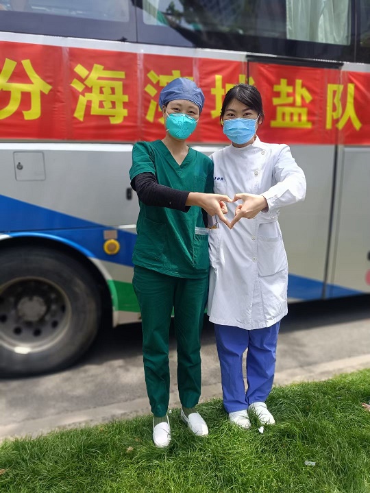 梁慧和姜蕾蕾一樣,在江蘇省鹽城市濱海縣第一人民醫(yī)院腦外科任職護士。作為一名擁有8年黨齡的老黨員,在得知上海需要支援時,她毫不猶豫地在單位報名加入了江蘇省援滬醫(yī)療隊鹽城濱海分隊?!拔抑辣砻靡言谝痪€日夜奮戰(zhàn)了一個多月了,這一次,我們姐妹倆也算是一起并肩作戰(zhàn)了”,梁慧笑著說道。