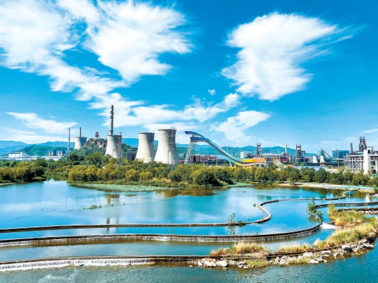 藍(lán)天白云下,首鋼園工業(yè)遺存融入永定河畔綠色生態(tài)環(huán)境,成為北京又一道靚麗風(fēng)景。 本報(bào)記者 鄧偉攝
