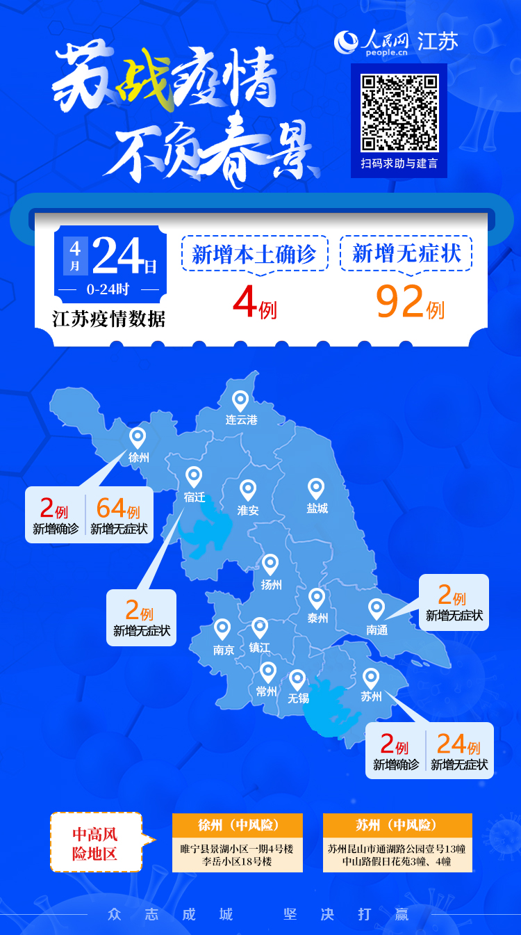 4月24日江蘇新增本土確診病例4例 本土無癥狀感染者92例