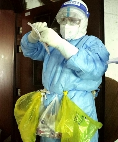 5月2日早上9點(diǎn)不到,劉彩麗來(lái)到小區(qū)門口,穿戴好防護(hù)服,腰上綁好采樣工具包、消毒用具,進(jìn)入封控區(qū)為居民進(jìn)行核酸采樣。小區(qū)是5層的老舊樓房,沒(méi)有電梯,裹著防護(hù)服的劉彩麗爬上頂樓時(shí)已經(jīng)氣喘吁吁,倚著欄桿平穩(wěn)了一下呼吸,輕輕敲著居民門,準(zhǔn)備投入采樣工作。經(jīng)過(guò)多輪核酸采樣,劉彩麗和居民早已熟稔。