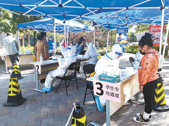 昨天,石景山區(qū)古城街道燕堤中街社區(qū)核酸檢測點設有學生檢測專用通道,方便學生隨來隨檢,不耽誤上網課。本報記者 吳鏑攝