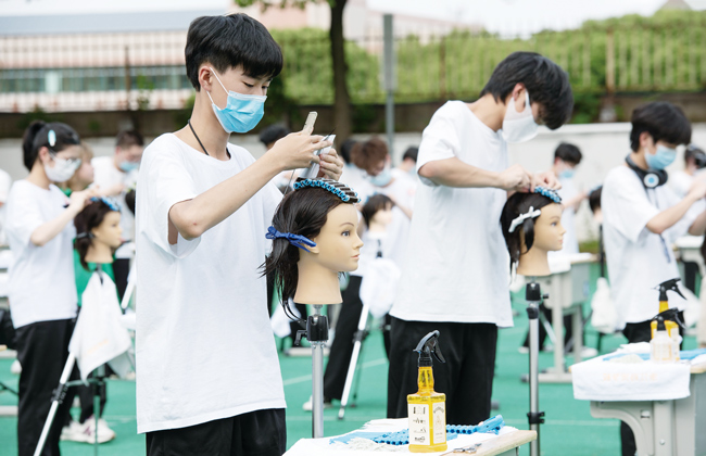 5月17日下午,金華電大(浙江貿(mào)易學(xué)校)舉辦2022年技能文化節(jié),該校美容美發(fā)與造型、烹飪、建筑、數(shù)字影像專業(yè)400多名學(xué)生,在學(xué)校操場上進(jìn)行職業(yè)技能展示比武,檢驗所學(xué)專業(yè)水平。(時寬兵)