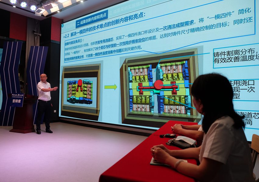 綠色生態(tài)座艙開發(fā)研究技術(shù)成果、變壓器套管換油裝置、高效率的一模四件發(fā)動(dòng)機(jī)缸體毛坯關(guān)鍵技術(shù)研究及成果轉(zhuǎn)化應(yīng)用、新能源退役動(dòng)力電池在SGMW制造系統(tǒng)梯次利用項(xiàng)目、重卷機(jī)組關(guān)鍵設(shè)備減時(shí)操作法……參加決賽的項(xiàng)目成果完成人采用PPT講解和現(xiàn)場答辯相結(jié)合的形式進(jìn)行對(duì)決。項(xiàng)目答辯人就項(xiàng)目立項(xiàng)背景、成果創(chuàng)新內(nèi)容和亮點(diǎn)、成果采納實(shí)施情況、經(jīng)濟(jì)效益、社會(huì)效益、獲獎(jiǎng)情況等進(jìn)行了介紹,并圍繞創(chuàng)新成果的創(chuàng)新性、原創(chuàng)性、成果應(yīng)用成熟性、質(zhì)量可靠性、成果的先進(jìn)程度、成果技術(shù)水平和難易程度、成果提高勞動(dòng)生產(chǎn)效率作用、經(jīng)濟(jì)效益、社會(huì)效益、成果的適用范圍和推廣前景等方面回答評(píng)委的提問。