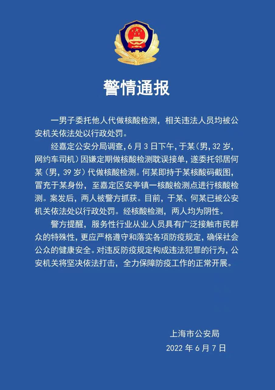 經(jīng)嘉定公安分局調(diào)查,6月3日下午,于某(男,32歲,網(wǎng)約車司機(jī))因嫌定期做核酸檢測(cè)耽誤接單,遂委托鄰居何某(男,39歲)代做核酸檢測(cè)。何某即持于某核酸碼截圖,冒充于某身份,至嘉定區(qū)安亭鎮(zhèn)一核酸檢測(cè)點(diǎn)進(jìn)行核酸檢測(cè)。案發(fā)后,兩人被警方抓獲。目前,于某、何某已被公安機(jī)關(guān)依法處以行政處罰。經(jīng)核酸檢測(cè),兩人均為陰性。