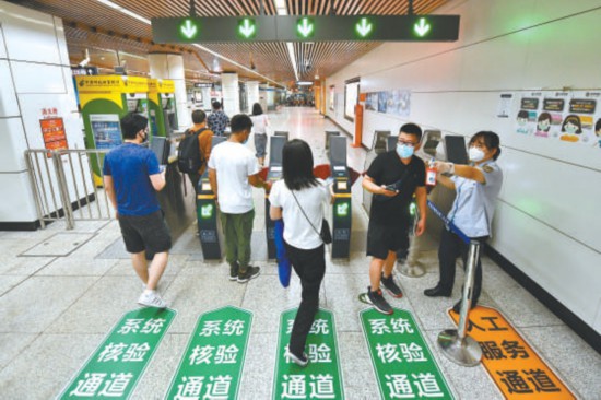 昨天,在地鐵十里河站,乘客從恢復(fù)開放的出入口進(jìn)出站,工作人員在閘機(jī)位置幫助還沒升級一卡通的乘客進(jìn)行升級。 本報記者 鄧偉攝