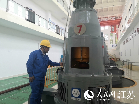 工作人員在江都水利樞紐第四抽水站檢查水泵運行。 人民網(wǎng) 張玉峰攝