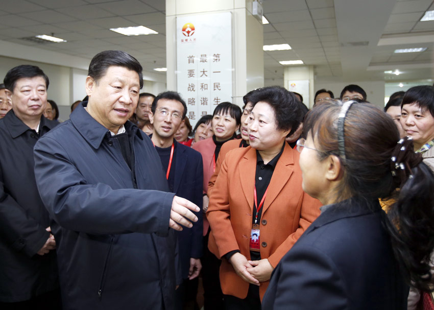 2013年11月27日下午,中共中央總書記、國家主席、中央軍委主席習(xí)近平在濟(jì)南市外來務(wù)工人員綜合服務(wù)中心同從事家政服務(wù)的“陽光大姐”交流。新華社記者鞠鵬攝