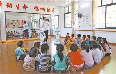 湖南新田縣彭梓城村小學(xué),老師指導(dǎo)孩子使用智能教育機(jī)器人進(jìn)行編程和學(xué)習(xí)。