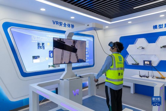 工作人員在雄安新區(qū)一智慧工地展示廳進行工地VR安全體驗(2022年4月13日攝)。新華社發(fā)(高盟 攝)