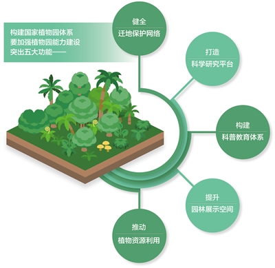 “構(gòu)建國家植物園體系,要加強植物園能力建設,突出五大功能?!敝苤救A介紹,一是健全遷地保護網(wǎng)絡,建立野生植物遷地保護栽培繁育體系、遷地保護信息平臺和綜合保藏體系,提升遷地保護綜合保藏能力,這是核心功能;二是打造科學研究平臺,開展遷地保護基礎科學研究活動,加強植物保護國際國內(nèi)交流合作,持續(xù)推進植物保護專業(yè)人才培養(yǎng);三是構(gòu)建科普教育體系,建設科普教育平臺,實施科普教育培訓計劃;四是提升園林展示空間,創(chuàng)新園林園藝展示方式,促進公眾深入了解和支持國家植物園建設;五是推動植物資源利用,加大引種馴化和新品種開發(fā)力度,提升城市生態(tài)建設和產(chǎn)業(yè)服務水平。