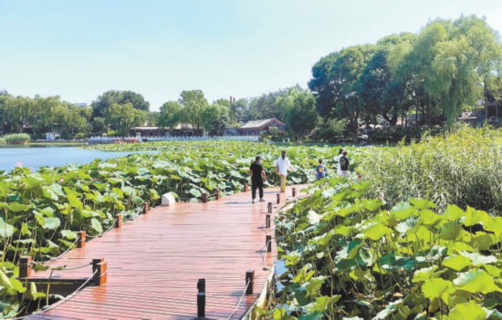 大運(yùn)河文化帶上,什剎海西海濕地公園里,柳林環(huán)堤,千頃荷花,蘆葦叢叢,水鴨為群,蟬聲鼎沸……老舍筆下的老北京什剎海,如今風(fēng)貌重現(xiàn)。