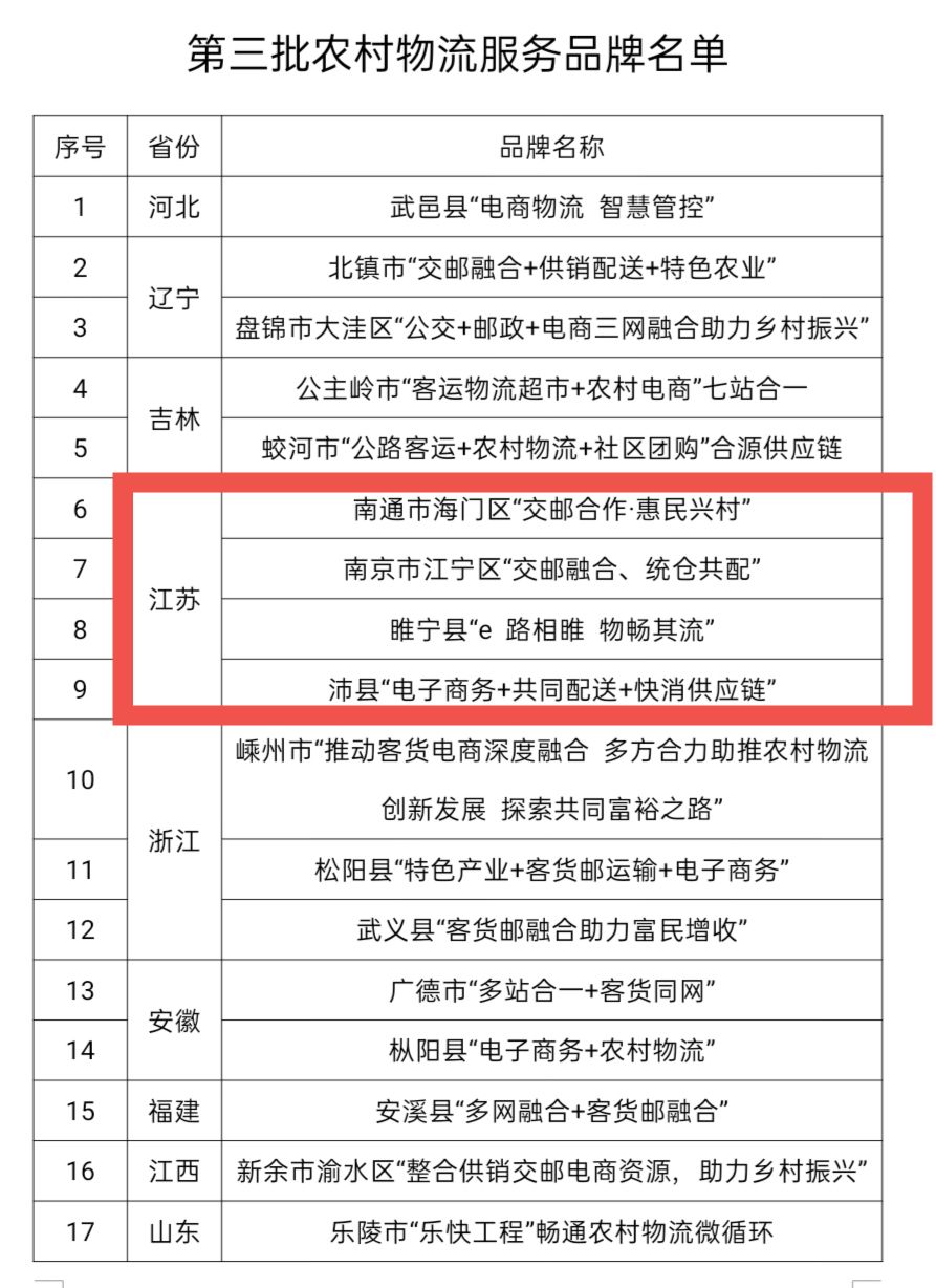 江蘇4項目入選全國第三批農(nóng)村物流服務(wù)品牌