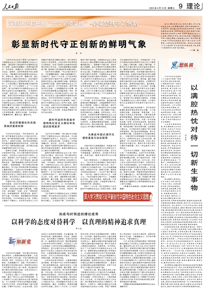 以科學的態(tài)度對待科學、以真理的精神追求真理,是中國共產(chǎn)黨人對待科學真理的一貫立場和鮮明態(tài)度。推進馬克思主義中國化時代化是一個追求真理、揭示真理、篤行真理的過程。100多年來,我們黨牢牢把握真理、守住正道,把馬克思主義基本原理同中國具體實際相結(jié)合、同中華優(yōu)秀傳統(tǒng)文化相結(jié)合,將其靈活地而不是刻板地、辯證地而不是教條地運用于實踐,不斷推進馬克思主義中國化時代化,用發(fā)展著的馬克思主義指導我國革命、建設、改革事業(yè),取得舉世矚目的偉大成就。黨的十八大以來,以習近平同志為核心的黨中央堅持解放思想、實事求是、守正創(chuàng)新,既堅持馬克思主義基本原理和科學社會主義基本原則,又與時俱進發(fā)展馬克思主義,著眼生動鮮活的新實踐新發(fā)展不斷作出新的理論創(chuàng)新創(chuàng)造,賦予馬克思主義鮮明的實踐特色、民族特色、時代特色,創(chuàng)立了習近平新時代中國特色社會主義思想。這一重要思想站在真理和道義的制高點上,以全新的視野深化對共產(chǎn)黨執(zhí)政規(guī)律、社會主義建設規(guī)律、人類社會發(fā)展規(guī)律的認識,以原創(chuàng)性理論貢獻標注了馬克思主義發(fā)展的新高度,體現(xiàn)科學社會主義理論邏輯和中國社會發(fā)展歷史邏輯的辯證統(tǒng)一,彰顯守正創(chuàng)新的理論品格和鮮明特質(zhì),實現(xiàn)了馬克思主義中國化時代化新的飛躍。