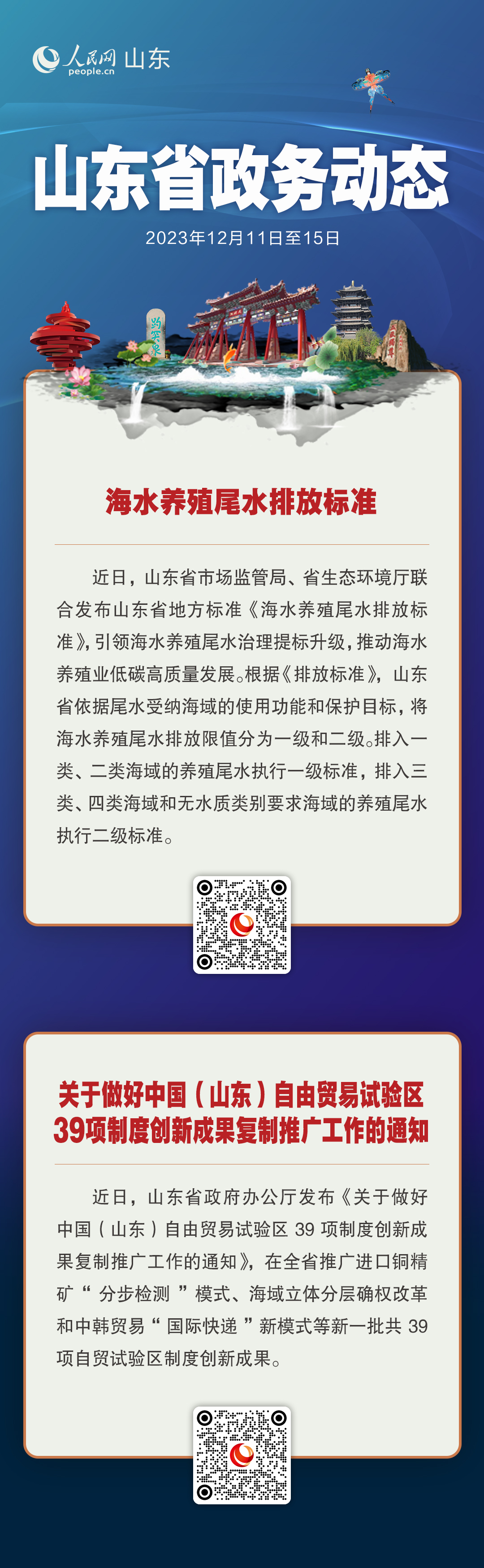 本周(12月11日至15日),山東省出臺了《海水養(yǎng)殖尾水排放標(biāo)準(zhǔn)》《關(guān)于做好中國(山東)自由貿(mào)易試驗區(qū)39項制度創(chuàng)新成果復(fù)制推廣工作的通知》,具體如下: