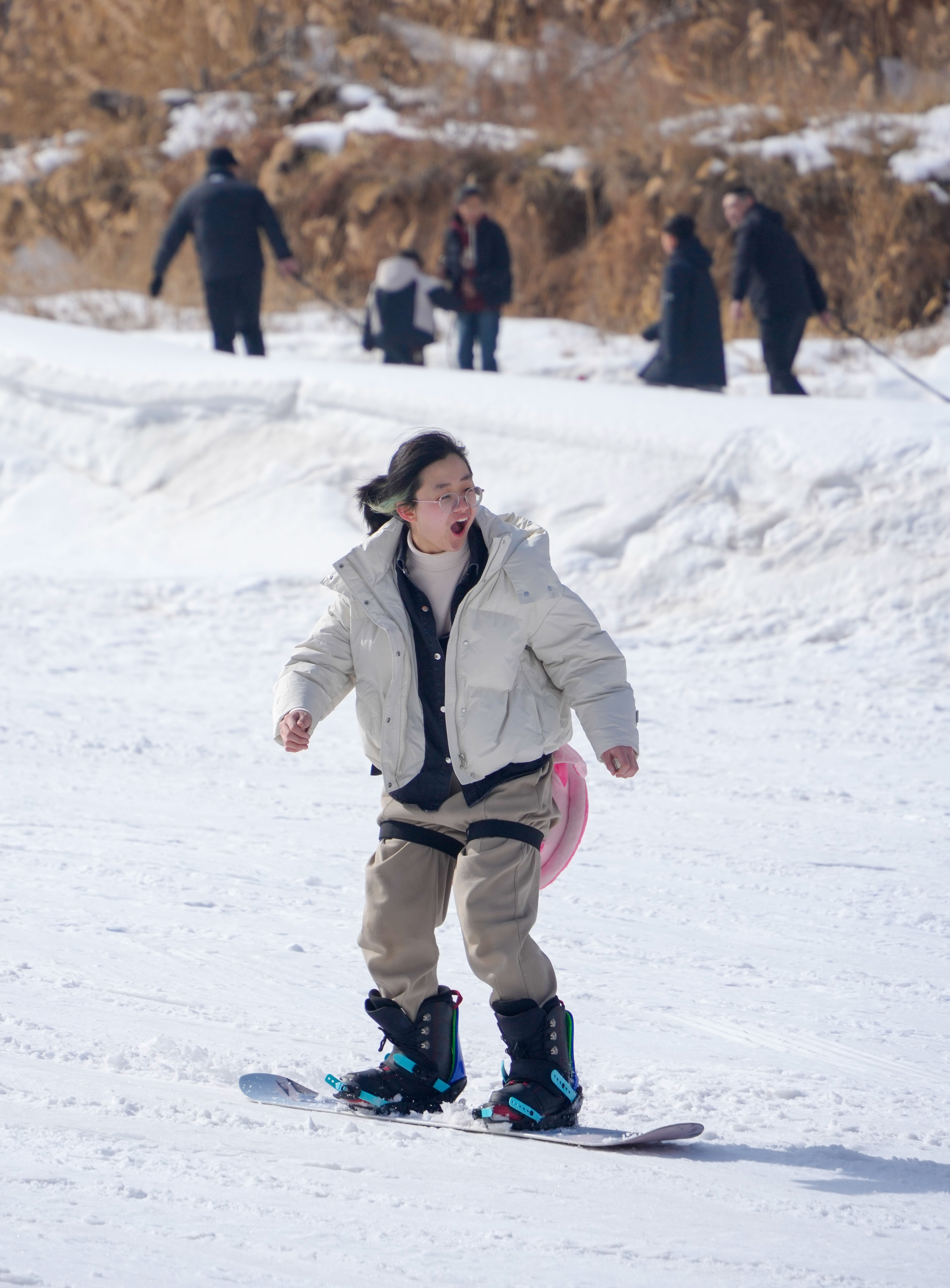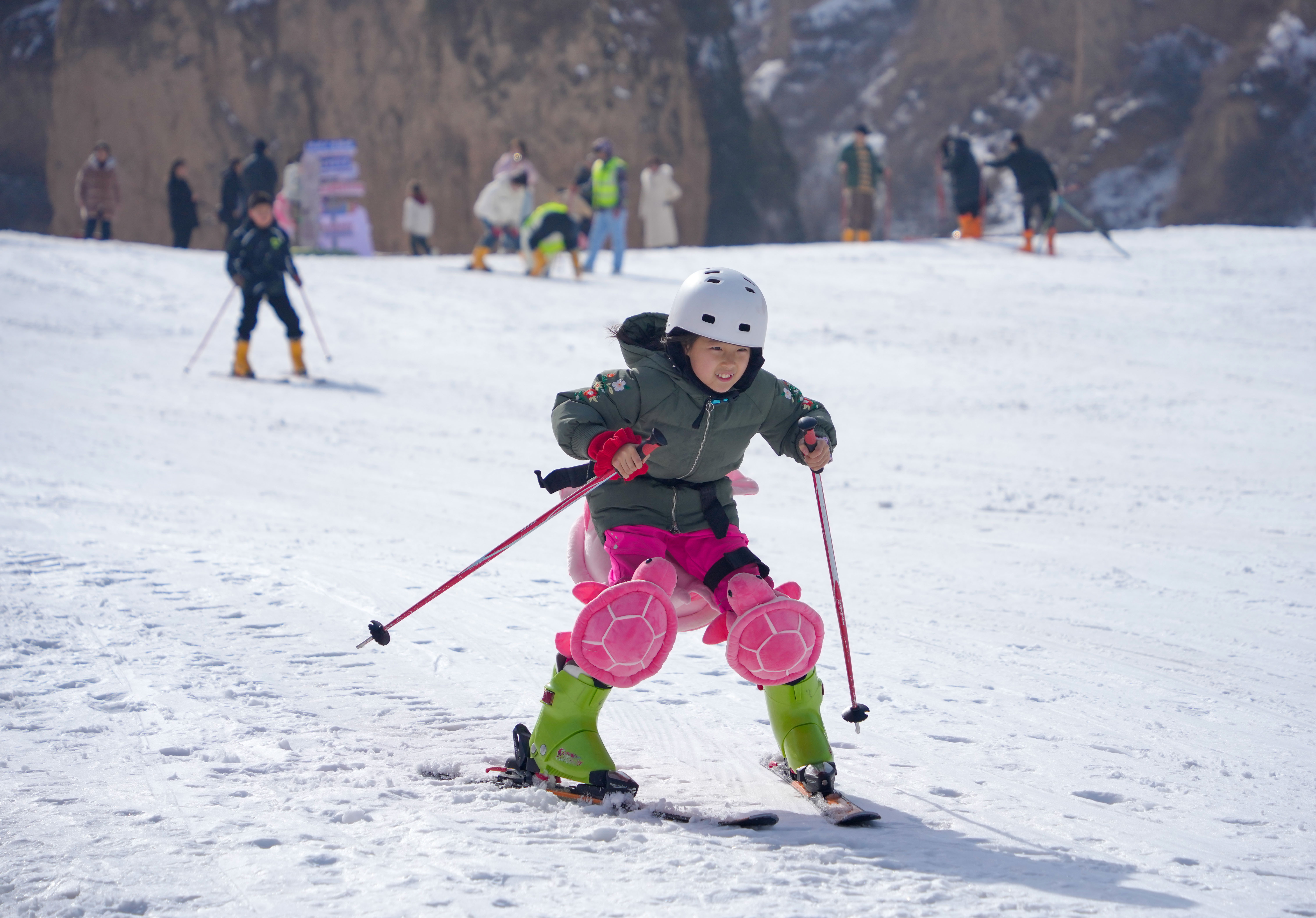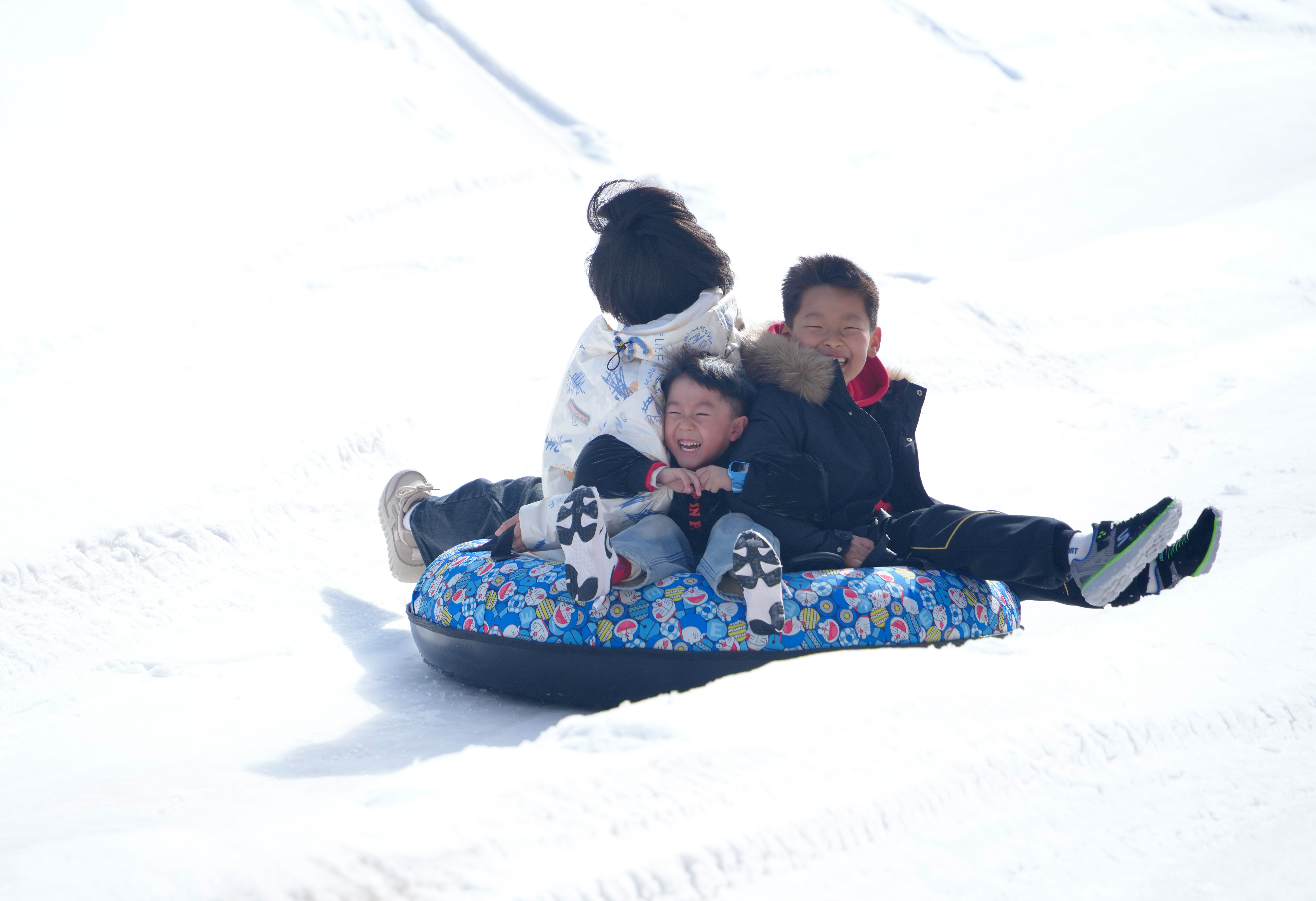 從滑雪坡上乘滑雪圈疾馳而下,大朋友、小朋友“全副武裝”盡情撒歡,游客們在冰雪運動中增強體質(zhì),樂享春節(jié)假期生活。(閆鑫 攝)