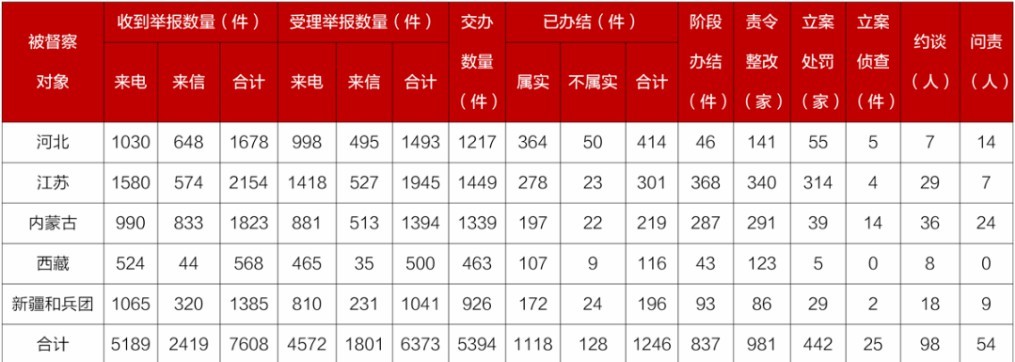 截至4月10日22時(shí),各督察組共收到群眾來(lái)電、來(lái)信舉報(bào)7608件,受理有效舉報(bào)6373件,經(jīng)梳理合并重復(fù)舉報(bào),累計(jì)向被督察對(duì)象轉(zhuǎn)辦5394件;被督察對(duì)象已辦結(jié)或階段辦結(jié)2083件,其中立案處罰442家;立案?jìng)刹?5件;約談黨政領(lǐng)導(dǎo)干部98人,問(wèn)責(zé)黨政領(lǐng)導(dǎo)干部54人。