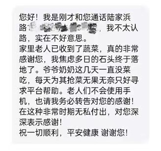 宋志勇的母親是一位使用智能手機(jī)不太“靈光”的老人。想到連短信都不會發(fā)的母親,再看到老人家屬代發(fā)的感謝短信,宋志勇覺得自己能成為應(yīng)急特需保供的一員挺榮幸。