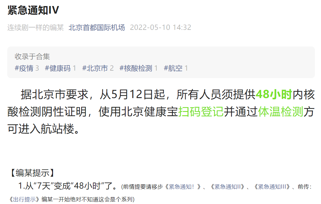 首都機(jī)場:5月12日起,進(jìn)入航站樓須持48小時(shí)內(nèi)核酸檢測陰性證明