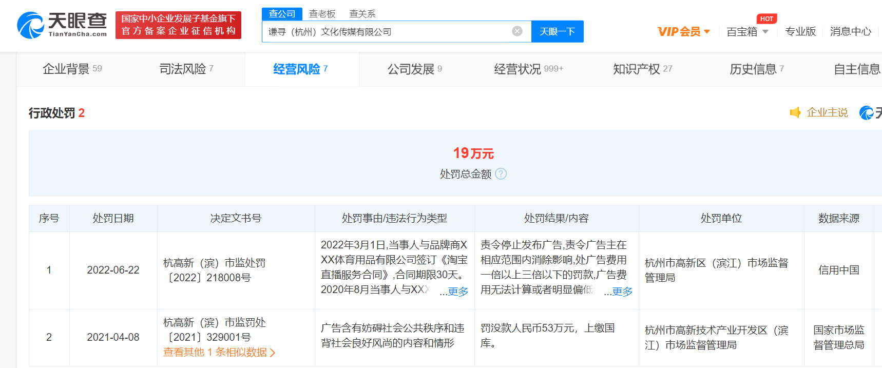 央廣網(wǎng)北京6月27日消息(記者 楊柳青) 近日,謙尋(杭州)文化傳媒有限公司因違反廣告法,被杭州市高新區(qū)(濱江)市場(chǎng)監(jiān)督管理局罰款19萬(wàn)元。