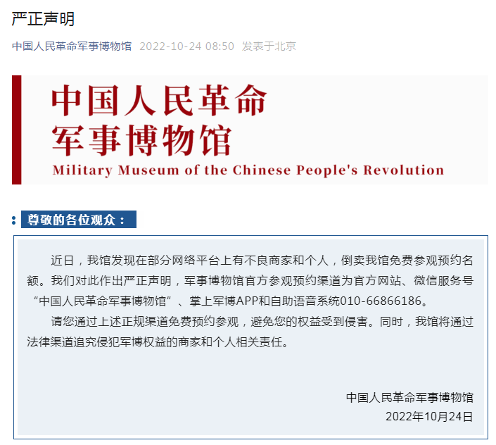 近日部分網(wǎng)絡(luò)平臺(tái)上有商家和個(gè)人倒賣該館免費(fèi)參觀預(yù)約名額。對此,軍博嚴(yán)正聲明,該館參觀預(yù)約渠道為官方網(wǎng)站、微信服務(wù)號(hào)“中國人民革命軍事博物館”、掌上軍博APP和自助語音系統(tǒng)010-66866186。觀眾要通過上述正規(guī)渠道免費(fèi)預(yù)約參觀,避免權(quán)益受到侵害。同時(shí),該館將通過法律渠道追究侵犯軍博權(quán)益的商家和個(gè)人相關(guān)責(zé)任。