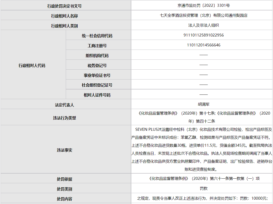 據(jù)文號(hào)為“京通市監(jiān)處罰〔2022〕3301號(hào)”行政處罰決定書顯示,七天酒店梨園店具體違法事實(shí)為:SEVEN PLUS沐浴露經(jīng)中檢科(北京)化妝品技術(shù)有限公司檢驗(yàn),檢出產(chǎn)品標(biāo)簽及產(chǎn)品備案憑證中未標(biāo)識(shí)成份:苯氧乙醇,檢測(cè)結(jié)果與產(chǎn)品標(biāo)簽及產(chǎn)品備案憑證不符。上述不合格化妝品進(jìn)貨數(shù)量30瓶,進(jìn)貨單價(jià)11.5元,貨值金額345元。