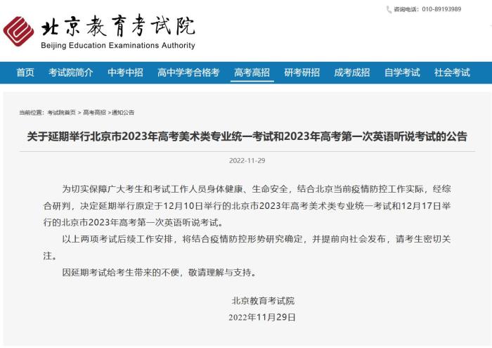 中新網(wǎng)11月29日電 據(jù)北京教育考試院網(wǎng)站消息,北京教育考試院29日發(fā)布公告,為切實保障廣大考生和考試工作人員身體健康、生命安全,結(jié)合北京當(dāng)前疫情防控工作實際,經(jīng)綜合研判,決定延期舉行原定于12月10日舉行的北京市2023年高考美術(shù)類專業(yè)統(tǒng)一考試和12月17日舉行的北京市2023年高考第一次英語聽說考試。