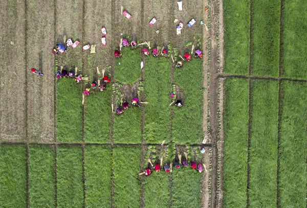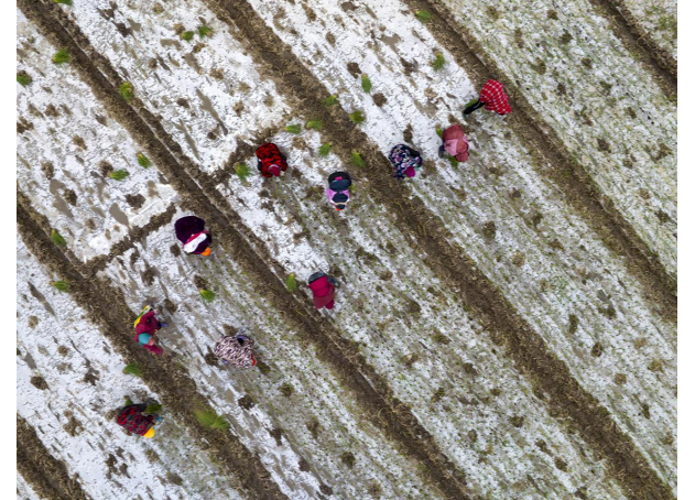 蔥農(nóng)在田間的塑料薄膜里移栽洋蔥苗,俯瞰就像地里落滿白雪(央廣網(wǎng)發(fā) 張清 攝)
