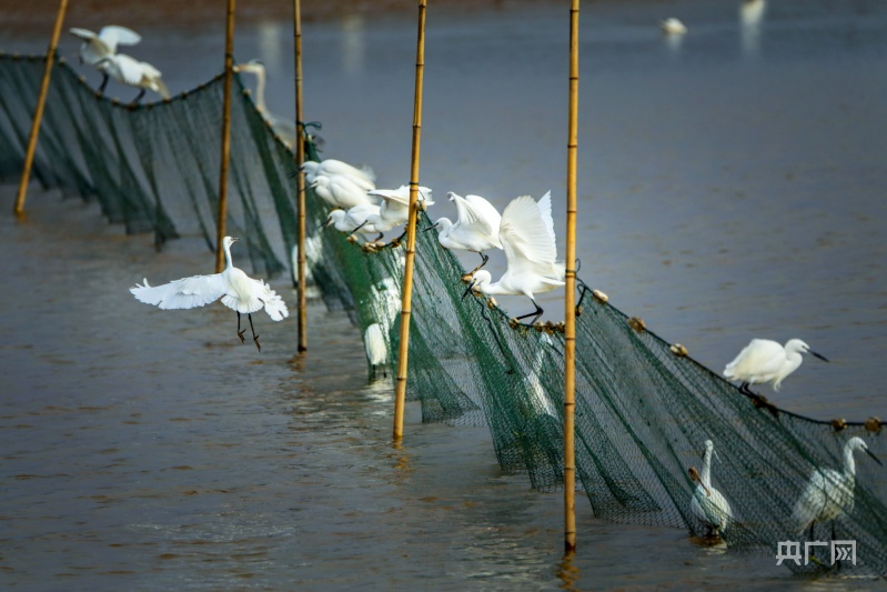 白鷺追逐在湖畔淺灘,捕食著可口的小魚小蝦(央廣網(wǎng)發(fā) 陳扶南 攝)