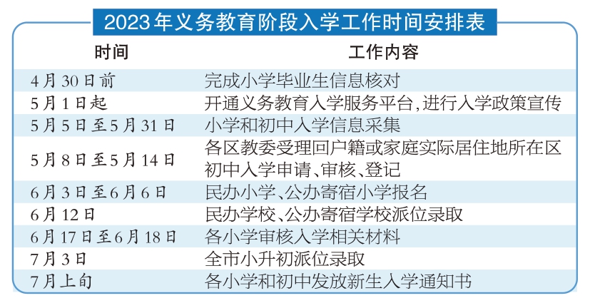 4月30日前,本市將完成小學(xué)畢業(yè)生信息核對;5月1日起,義務(wù)教育入學(xué)服務(wù)平臺開通,進(jìn)行入學(xué)政策宣傳;5月5日至5月31日,進(jìn)行小學(xué)和初中入學(xué)信息采集。